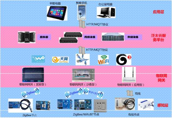 智慧教室設備能夠體現物聯(lián)網(wǎng)的三個(gè)層次(應用層、網(wǎng)絡(luò )層、感知層),運用傳感器、射頻識別(RFID)等技術(shù),使信息傳感設備實(shí)時(shí)感知任何需要的信息,按照約定的協(xié)議,通過(guò)可能的網(wǎng)絡(luò )(如基于WIFI的無(wú)線(xiàn)局域網(wǎng)、移動(dòng)通信、電信網(wǎng)等)接入方式,把任何物品與互聯(lián)網(wǎng)相連接,進(jìn)行信息交換和通信,實(shí)現物與物、物與人的泛在鏈接,實(shí)現對物品的智慧化識別、跟蹤、監控和管理。 同時(shí),智慧教室還能滿(mǎn)足學(xué)校物聯(lián)網(wǎng)技術(shù)專(zhuān)業(yè)開(kāi)設的物聯(lián)網(wǎng)導論、傳感器原理及應用、無(wú)線(xiàn)傳感器網(wǎng)絡(luò )及應用、RFID技術(shù)及應用、物聯(lián)網(wǎng)工程及應用、物聯(lián)網(wǎng)標準與中間件技術(shù)、物聯(lián)網(wǎng)應用系統設計等課程的實(shí)踐實(shí)訓教學(xué)需要,并為學(xué)生或教師的物聯(lián)網(wǎng)技術(shù)應用項目開(kāi)發(fā)提供平臺。