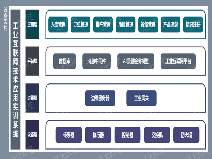 該設備以離散行業(yè)全流程產(chǎn)線(xiàn)為背景,具有完整的工業(yè)互聯(lián)網(wǎng)網(wǎng)絡(luò )、平臺、安全、標識體系架構,可以支撐工業(yè)互聯(lián)網(wǎng)專(zhuān)業(yè)數據采集、網(wǎng)絡(luò )互聯(lián)、安全防護、邊緣計算、平臺運維、數據分析、標識解析、工業(yè)APP等項目實(shí)訓,還可以開(kāi)展智能制造專(zhuān)業(yè)電氣控制及運動(dòng)控制,人工智能專(zhuān)業(yè)機器視覺(jué)及質(zhì)量模型分析等課程實(shí)訓,滿(mǎn)足學(xué)生全流程參與互動(dòng)、多維度融合應用的需求。