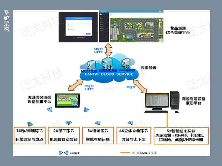系統采用B/S架構,本地架設有PC服務(wù)器,PC客戶(hù)端、手持機客戶(hù)端和物聯(lián)網(wǎng)網(wǎng)關(guān)進(jìn)行信息交互;以RFID設備作為人員和食品信息流通的載體,智能車(chē)作為各個(gè)環(huán)節的紐帶,使用機械手模擬食品流通中的自動(dòng)化裝卸,使用立體倉庫實(shí)現物品倉儲管理,使用智能終端掃描二維碼獲取食品的溯源信息,結合有線(xiàn)網(wǎng)絡(luò )、ZigBee傳感器網(wǎng)絡(luò )、嵌入式技術(shù)、Android開(kāi)發(fā)、TCP/UDP網(wǎng)絡(luò )通信、Web應用等物聯(lián)網(wǎng)關(guān)鍵技術(shù),使食品在整個(gè)環(huán)節中處于有效監控中,實(shí)現肉菜流通全過(guò)程的信息讀取、傳輸與反向溯源。