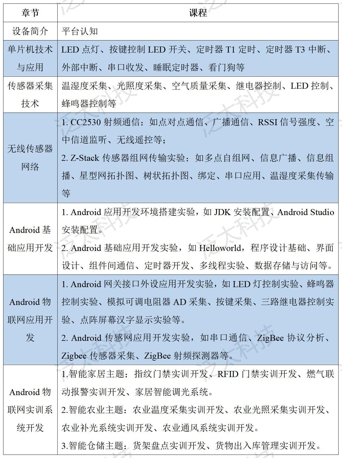 該平臺綜合運用傳感器技術(shù)、RFID技術(shù)、接口控制技術(shù)、無(wú)線(xiàn)傳感網(wǎng)組網(wǎng)技術(shù)、Android應用開(kāi)發(fā)等,依托部署在操作臺上的315MHz設備、ZigBee節點(diǎn)、射頻設備、控制設備、Cortex-A9網(wǎng)關(guān)以及軟件系統,實(shí)現智能家居門(mén)禁安防監控、智能家居環(huán)境監測、家居設備智能控制、農業(yè)環(huán)境智能檢測、農業(yè)設備智能控制、以及貨架信息動(dòng)態(tài)感知等功能。平臺提供智能家居實(shí)訓應用程序、智能農業(yè)實(shí)訓應用程序、智能貨架實(shí)訓應用程序等多個(gè)應用案例,為用戶(hù)的綜合實(shí)訓開(kāi)發(fā)提供支持。