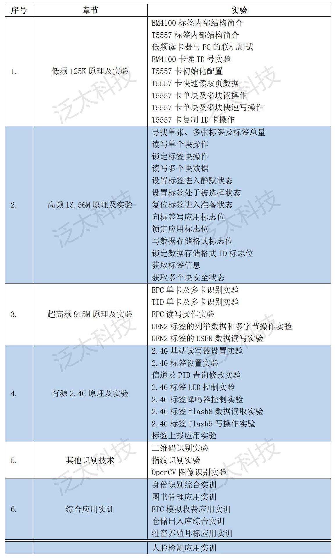 該產(chǎn)品包含125KHz低頻模塊、13.56MHz高頻模塊、915MHz超高頻模塊、2.4GHz有源讀寫(xiě)模塊、條碼二維碼指紋識別板、智能控制板、以及嵌入式網(wǎng)關(guān)。實(shí)驗課程重點(diǎn)放在對各個(gè)頻段RFID模塊的管理、控制和上位機程序的應用開(kāi)發(fā)上,學(xué)生可以利用開(kāi)放的通信協(xié)議,使用多種編程語(yǔ)言(C#、Android等)編寫(xiě)上位機應用程序與RFID模塊、二維碼指紋識別節點(diǎn)、智能控制板進(jìn)行數據交互,實(shí)現各種物聯(lián)網(wǎng)應用場(chǎng)景。