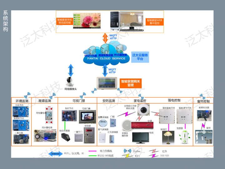 該系統綜合運用傳感器采集、無(wú)線(xiàn)傳感器網(wǎng)絡(luò )、自動(dòng)控制、嵌入式系統開(kāi)發(fā)、網(wǎng)絡(luò )通信、Android移動(dòng)應用開(kāi)發(fā)、Web應用開(kāi)發(fā)等物聯(lián)網(wǎng)技術(shù),集成家居環(huán)境傳感器、終端控制器、家用電器、家居網(wǎng)關(guān)等,實(shí)現家居生活環(huán)境的自動(dòng)監測、自動(dòng)調節、安防報警、視頻監控、遠程監控等功能,貼近實(shí)際智能家居系統,為物聯(lián)網(wǎng)專(zhuān)業(yè)教學(xué)提供了一個(gè)完備的工程應用實(shí)訓系統。