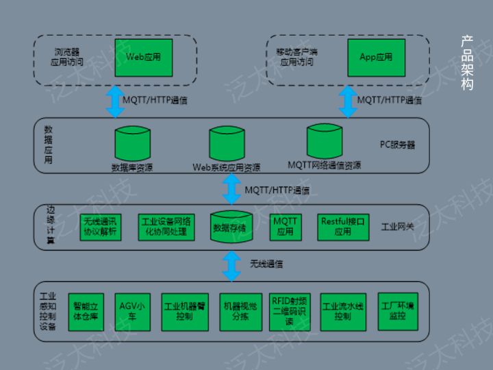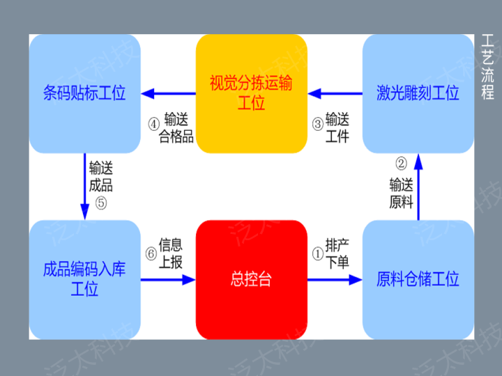 沙盤(pán)(SeaIOT-EA-IM6-01),由原料倉儲工位、激光雕刻工位、視覺(jué)分揀運輸工位、包裝貼標工位、成品標識入庫工位、總控制臺共六個(gè)獨立工位拼裝組成,涵蓋立體庫位、堆垛機、加工流轉轉盤(pán)、激光雕刻機、多自由度機器臂、機器視覺(jué)檢測裝置、流水線(xiàn)傳送帶、二維碼氣動(dòng)打標裝置、RFID讀寫(xiě)模塊、條碼識讀模塊以及安裝在空壓機設備上的壓力傳感器、工廠(chǎng)環(huán)境監測傳感器、工業(yè)指示屏等工業(yè)常見(jiàn)設備,結合工業(yè)網(wǎng)關(guān)、邊緣服務(wù)器及工業(yè)互聯(lián)網(wǎng)平臺,通過(guò)工業(yè)現場(chǎng)總線(xiàn)和無(wú)線(xiàn)自組網(wǎng)通信技術(shù),實(shí)現取料、寫(xiě)碼、讀碼、加工、識別、分揀、運輸、貼標、寫(xiě)碼、讀碼、識讀二維碼、入庫等激光加工整體生產(chǎn)流程,達到工業(yè)生產(chǎn)跟蹤、產(chǎn)線(xiàn)生產(chǎn)數量統計、設備運行狀態(tài)監測、工件質(zhì)量統計等智慧化管理。